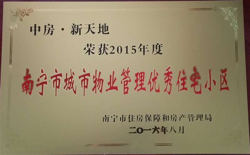 • 中房•新天地榮獲“2015年度南寧市城市物業(yè)管理優(yōu)秀住宅小區(qū)”稱號
