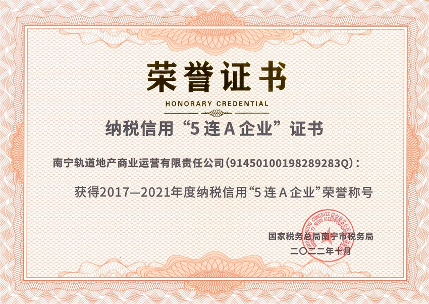 【喜報】誠信納稅 守法經營!軌道地產商業(yè)公司榮獲納稅信用“5連A”企業(yè)榮譽