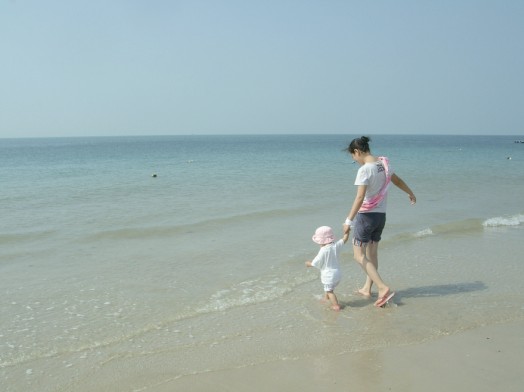 海灘上留下了無(wú)數(shù)指尖大小的小孔隙,出于好奇,我蹲下來靜靜地觀察,發(fā)現(xiàn)有小小的螃蟹從小孔隙里爬出來,象我一樣好好沐浴燦爛陽(yáng)光、溫暖海風(fēng);有些頂著米粒大的沙團(tuán)推出小孔隙,原來是小螃蟹寶寶在造穴,多勤勞呀,從小就養(yǎng)成了愛勞動(dòng)的習(xí)慣;最好玩的是好不容易逮著一只螃蟹寶寶放在手心任其橫行霸道,直癢得我開懷大笑……..